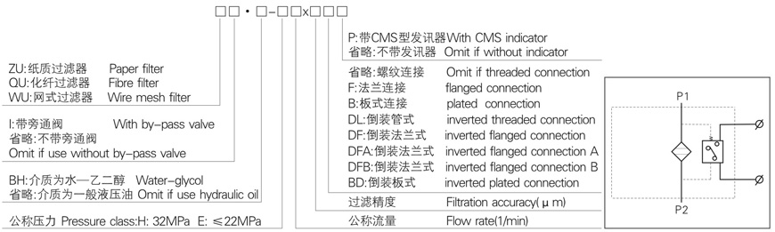 注:*為過濾精度,#為過濾材料,若使用介質(zhì)為水—乙二醇,濾材為紙質(zhì),帶發(fā)訊器和旁通閥,則過濾器型號(hào)為:ZUI·BH—H63×*P,濾芯型號(hào)為HX·BH-63×*濾材為化纖,帶發(fā)訊器,則過濾器型號(hào)為:QU·BH-63×*P, 濾芯型號(hào)為:HX·BH-63×*Q,濾材為金屬網(wǎng),帶發(fā)訊器,則過濾型號(hào)為:WU-H63×*P,濾芯型號(hào)為:HX-63×*W