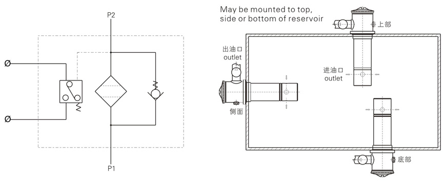 本過濾器可直接安裝在油箱側邊,底部或上部,過濾器頭露在油箱外,吸油筒體浸入油箱內液面以下,出油口設有管式、法蘭式連接,過濾器內設有自封閥等裝置,使管路省去裝截止閥等其它管件,從而使管路簡化,安裝方便。