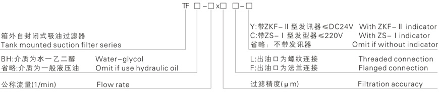 注:*為過濾精度,若使用介質為水一乙二醇,公稱流量160L/min,過濾精度80μm,帶ZS-Ⅰ型發訊器,則過濾器型號為TF·BH-160x80L-C,濾芯型號為TFX·BH-160x80。