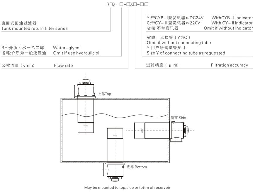 注:*為過濾精度,若使用介質為水一乙二醇,公稱流量160L/min,過濾精度10um,帶CYB-Ⅰ型發訊器,則過濾器型號為RFB · BH-160X10Y,濾芯型號為FBX · BH-160x10。