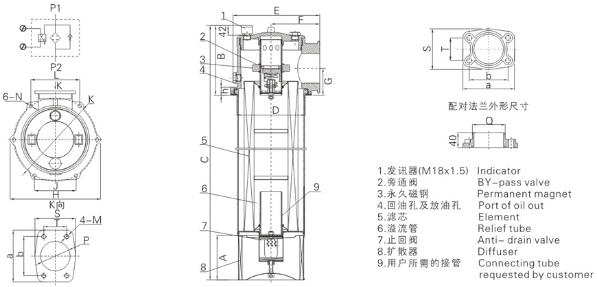 6、具有目測指示和電發訊二合一發訊裝置、溢流管、積污盅;當濾芯逐步堵塞后,可在目測表上觀察濾芯堵塞情況,同時還可接電發訊(發訊值為0.35MPa)。在濾芯底部設置溢流管及積污盅,更換濾芯時可隨同一起帶出,從而避免了污染物重新掉入油箱內的現象。
