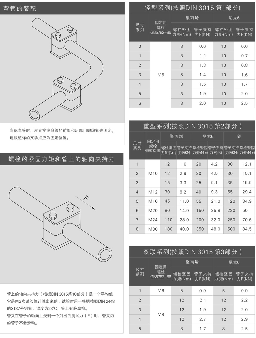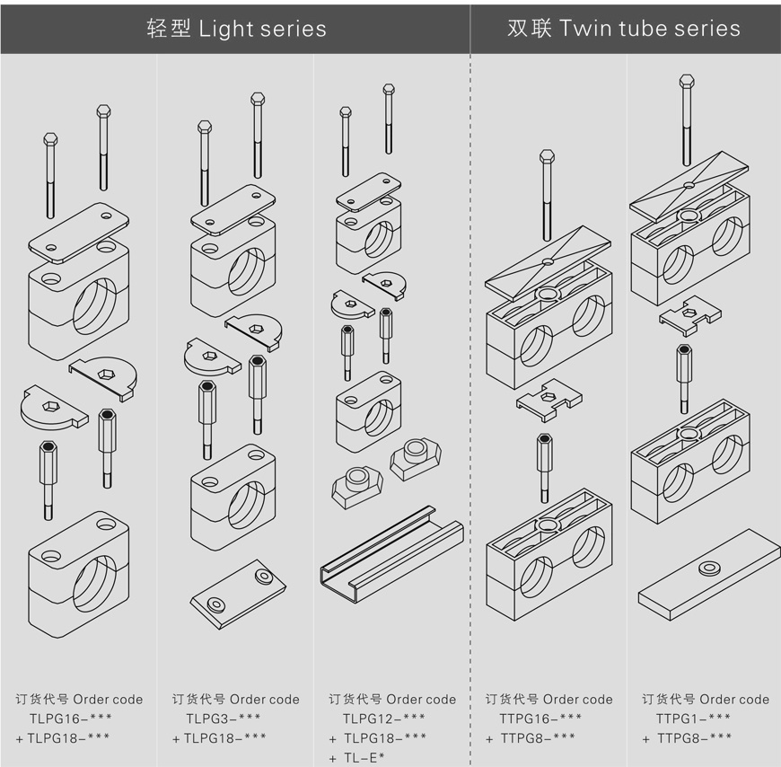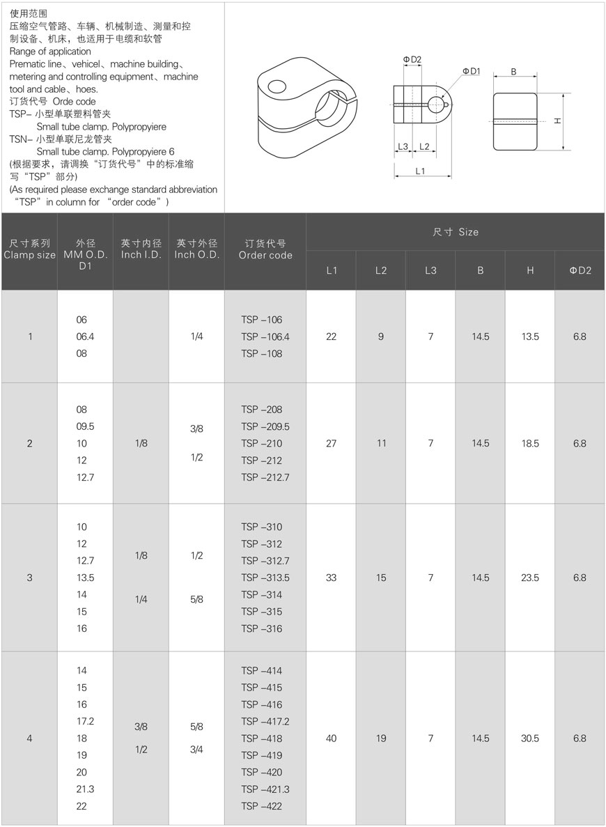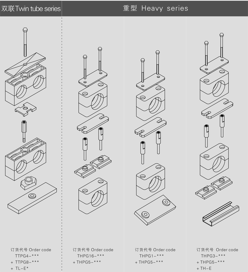 雙聯系列管夾應用于5種尺寸系列的普通機械壓力管子,管子外徑Φ6~42mm。